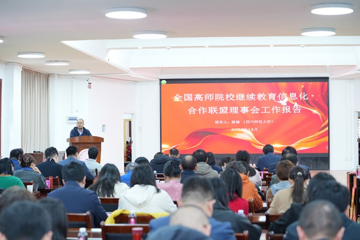 联盟轮值理事长单位、四川师范大学继续教育学院院长陈驰代表联盟理事会作工作报告。报告回顾了2025年联盟开展的主要工作,包括不断更新升级支持服务平台,持续完善课程共建共享机制,以及推动成立中国教育技术协会普通高校继续教育分会等。同时,报告也对2026年联盟的重点工作方向进行了展望,包括利用联盟机制探索学历教育和非学历教育协同发展,开展2026年度继续教育工作先进集体和先进个人评选以及立足师范教育特色、稳步扩大理事单位规模等内容,为下一阶段工作擘画了清晰路径。