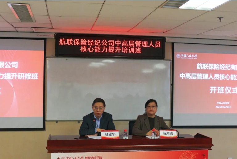 2025年12月8日,航联保险经纪有限公司中高层管理人员核心能力提升研修班在中国人民大学正式开班。航联保险经纪有限公司董事长赵建华,中国人民大学继续教育学院副院长陈英霞出席开班仪式,开班仪式由中国人民大学继续教育学院教育发展中心短期培训项目主管王彬彬主持。