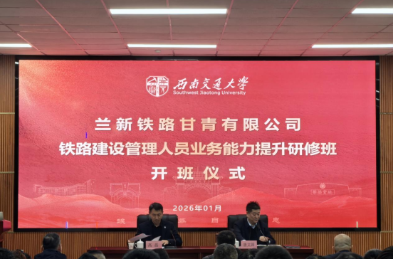 2026年1月19日上午,兰新铁路甘青有限公司铁路建设管理人员业务能力提升研修班(第一期)在西南交通大学峨眉校区顺利开班。兰新铁路甘青有限公司党委书记、总经理唐文国,西南交通大学峨眉校区党委副书记兼管委会副主任高磊,以及来自兰新铁路甘青有限公司的参训学员们出席了开班仪式。