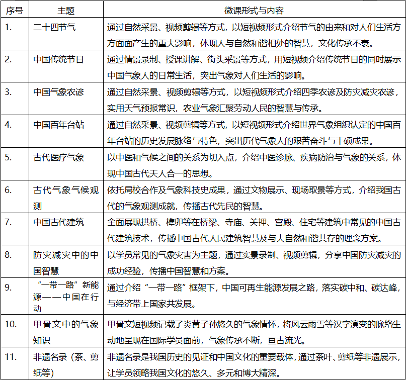 经过一年多的尝试,2021年3月,干部学院国际培训部正式发文组建“国际培训气象文化微课团队”。4月,学院青年项目“国际培训气象文化微课程体系开发探究”获批。依托两年微课开发的经验积淀以及学院的大力支持,国际培训部积极探索气象文化微课程体系建设。在微课团队的共同努力下,现已探索出以二十四节气、中华传统节日、百年台站、气象农谚、气象甲骨文、“一带一路”碳中和等20个主题为主体的微课程体系,涉及中国气象文化和中国气象成果的方方面面。截止2022年4月,微课团队已按计划完成微课开发46学时,全部上线国际培训班与国际学员见面。