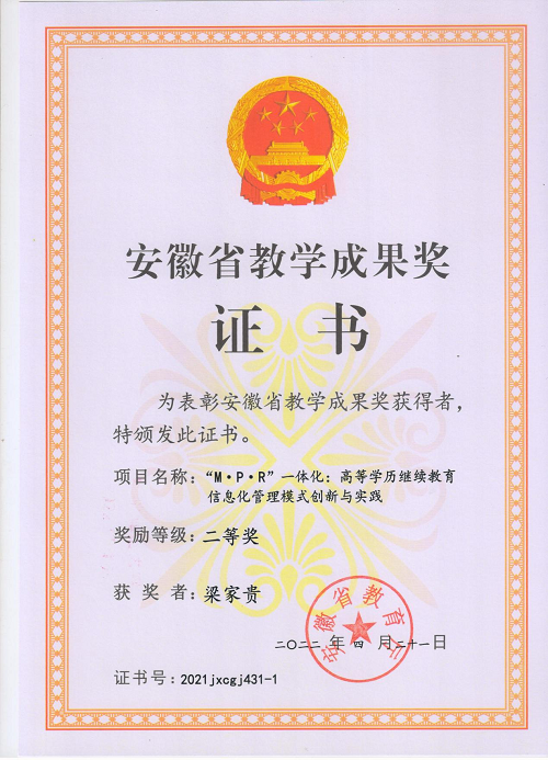 2015年9月21日,在马鞍山召开的安徽省学历继续教育远程化教学模式改革与信息化建设工作推进会上,阜阳师范大学作为第二期十所高校代表,介绍了平台建设与应用、资源建设、远程化教学改革进展情况和成功经验,引起了与会人员的强烈反应。安徽继续教育网络园区编发的历年《安徽继续教育网络园区建设发展报告》对学校所进行的学历继续教育远程化教学模式改革与信息化建设工作所取得的成绩给予了高度评价;《“M•P•R”一体化:高等学历继续教育信息化管理模式创新与实践》教学成果荣获安徽省2021年度优秀教学成果二等奖。