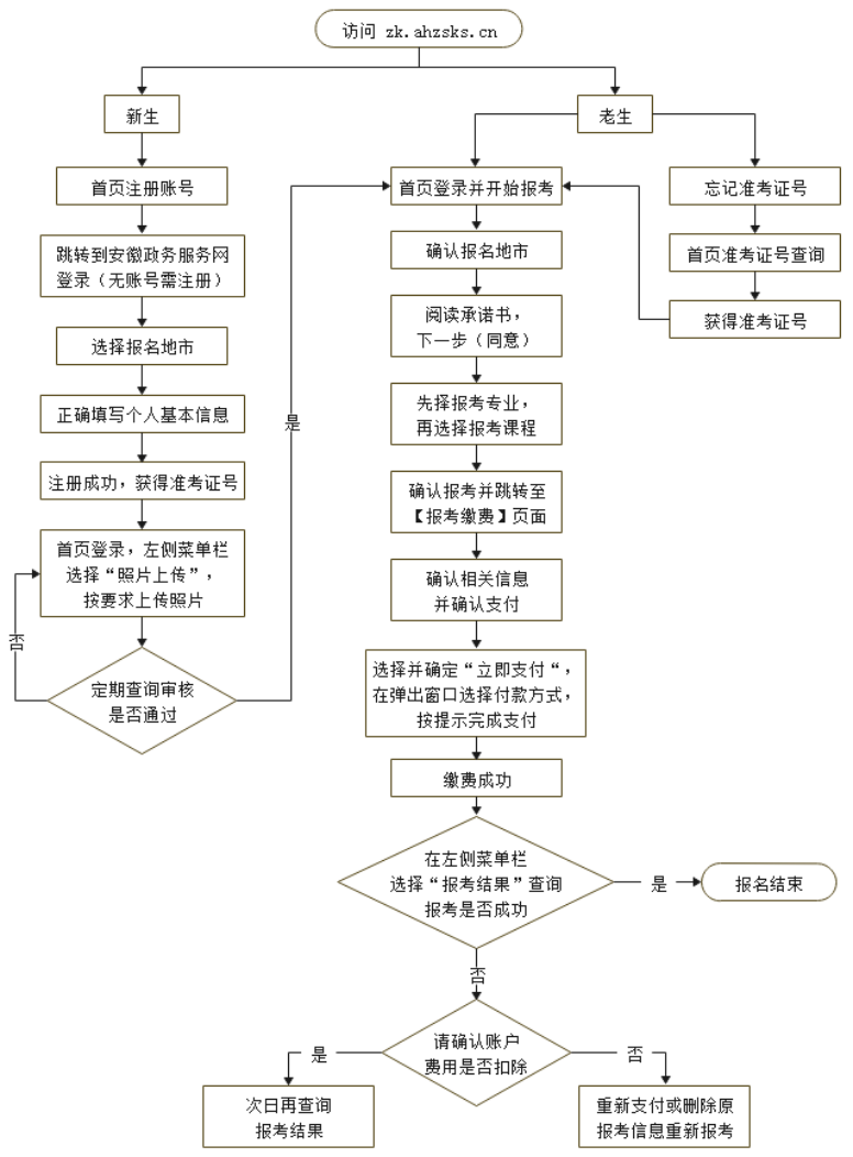 报名网址为https://zk.ahzsks.cn/。系统限定每位考生在报名期间只能报考一次(最多选报四门课程),考生若报考多个专业内课程也必须一次性完成。报名采用网上缴费,缴费截止时间:3月6日19:00(报名期间每日23:00至次日1:00是银行对账时间,请勿在此时段缴费)。考生缴费成功后,无法撤销或退费,也无法进行补报、改报。报名网站不提供教材征订服务,考生可根据我院公布的教材版本自行购买。