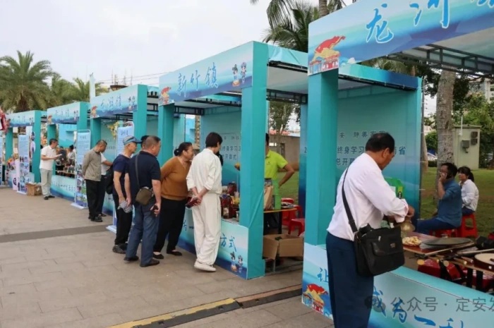 当日下午4时起,沿江公园欢乐广场已人潮涌动,热闹非凡。定安县10个镇人民政府(社区教育学校)在此设置展销摊位,富硒生态香米、仙沟牛肉、糟粕醋、新竹香芋等特色产品与小吃,以及各类文创产品,吸引众多群众驻足观看、体验品尝。与此同时,“百姓学习之星”“终身学习品牌项目”巡展同步开展,通过图文展板与互动体验,集中呈现近年来全省各市县在终身学习方面,个人学习和终身学习品牌项目建设的实践成果。