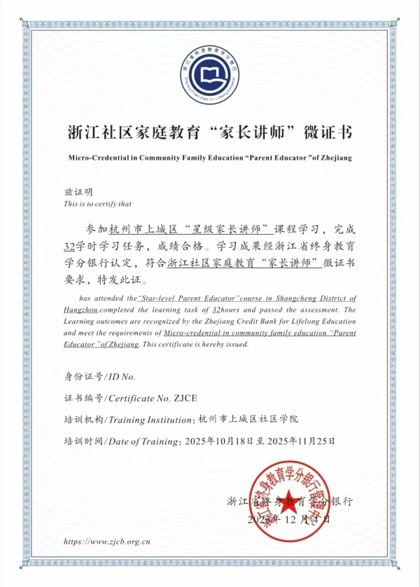12月4日,在2025年长三角学分银行与终身学习制度建设研讨会上,一场特别的颁证仪式引人注目。来自杭州市上城区的三位市民代表,接过浙江省首批社区家庭教育“家长讲师”终身学习微证书,标志着该省在构建服务全民终身学习体系上,实现从理念到实践的关键跨越。