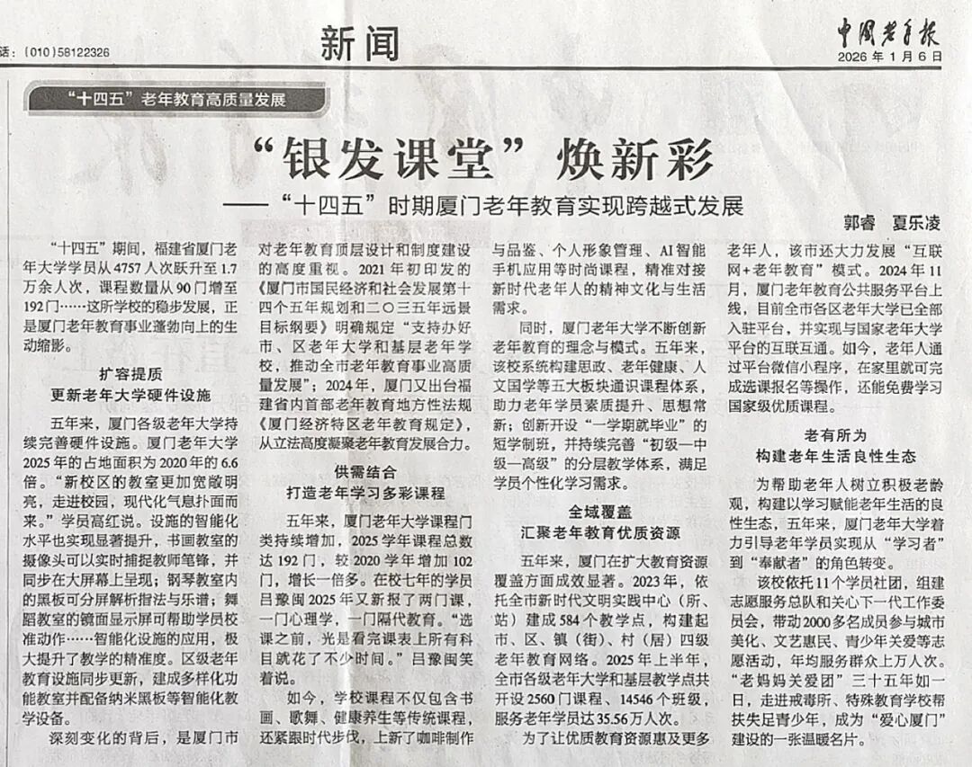 “十四五”期间,福建省厦门老年大学学员从4757人次跃升至1.7万余人次,课程数量从90门增至192门……这所学校的稳步发展,正是厦门老年教育事业蓬勃向上的生动缩影。