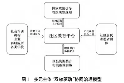 构建多元主体“双轴驱动”协同治理模型,如图1,“行政职能部门协作配合、纵向行政层级上下联动、横向其他主体共同参与”。纵向轴建立“国家政策引导—省级统筹规划—区县资源整合—街镇落地实施”的行政协同链;横向轴形成“社区学校+企业+社会组织+居民”的治理联盟。多元共治是协同治理的核心,参与主体通过分工协作、权责划分、平等协商、信息共享等各种机制,达到共治的状态,这是社区教育治理有序开展的条件。[7]
