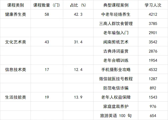 健康养生类课程占比最高,包含“中老年经络养生”“三高人群饮食管理”等系列课程。这类课程主要涵盖慢性病防治、中医保健等内容,反映出老年群体对健康维护的迫切需求。文化艺术类课程次之,以“闽南剪纸艺术”“古典诗词鉴赏”为代表,通过非遗传承、艺术鉴赏等模块,既满足老年人的审美需求,又具有文化传承的社会价值。信息技术类课程明显不足,仅设有“手机摄影全攻略”“微信就医挂号教程”等基础数字技能课程,与老年人日益增长的数字化生活需求存在供给缺口。生活技能类课程如“老年人权益保障”“家庭盆栽养护”等,虽然涉及法律、生活等实用领域,但缺乏进阶性课程设计,尚未形成系统化的课程体系。